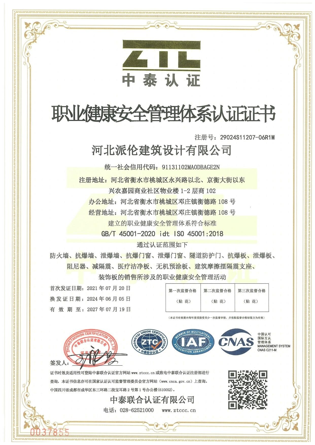 职业健康安全管理体系认证证书-河北派伦建筑设计有限公司