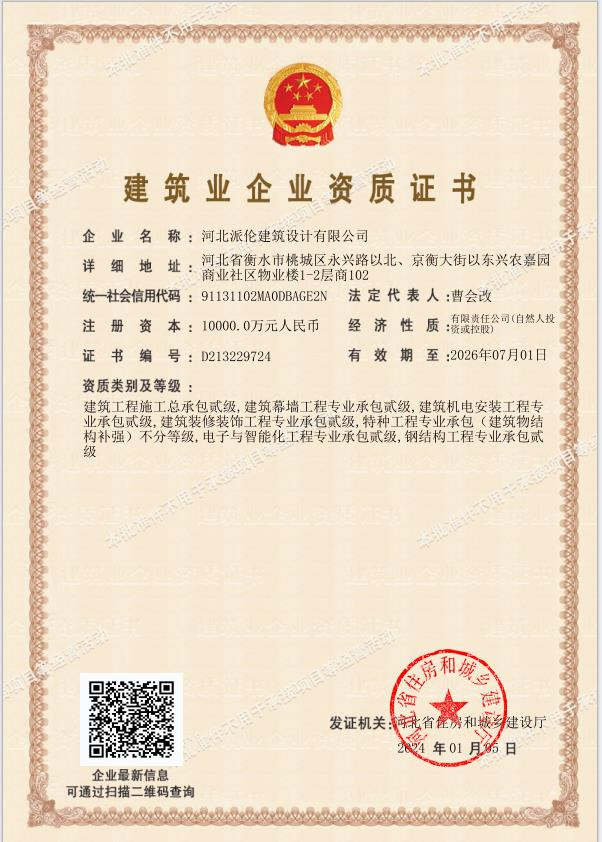建筑企业资质证书-河北派伦建筑设计有限公司
